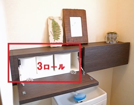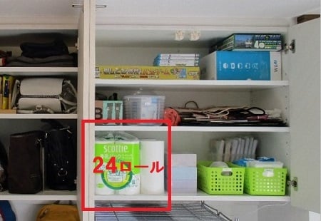さらに、トイレットペーパーを定位置管理している場所に、マックスでストックしてみたら、どのくらい持つのだろうと思いました。