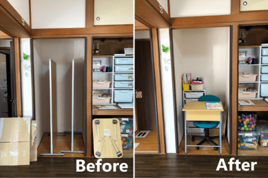 使用していないパーテーションが置かれ、活用出来ていなかった奥まったコーナーは、スタッフさんの引き出しと机を入れました。