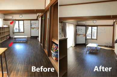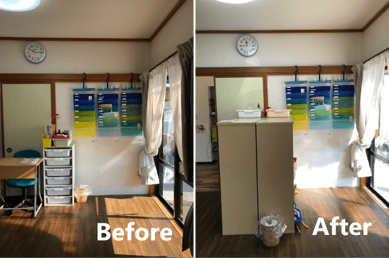 その後、ロッカーの位置を変えたことで、入口付近に荷物を広げてしまう子がいるので、配置を変えたとのご連絡を頂きました。